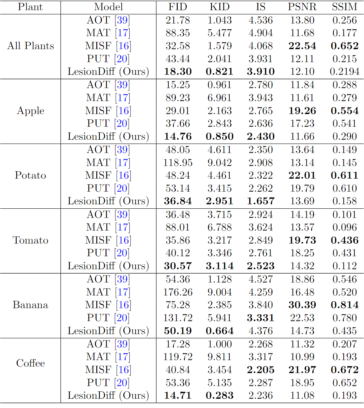 LesionDiff surpasses other models in producing realistic and varied plant disease images, achieving superior FID and KID scores. By focusing on generating visually convincing lesions instead of exact pixel-level details, it proves highly effective for synthesizing plant disease imagery.